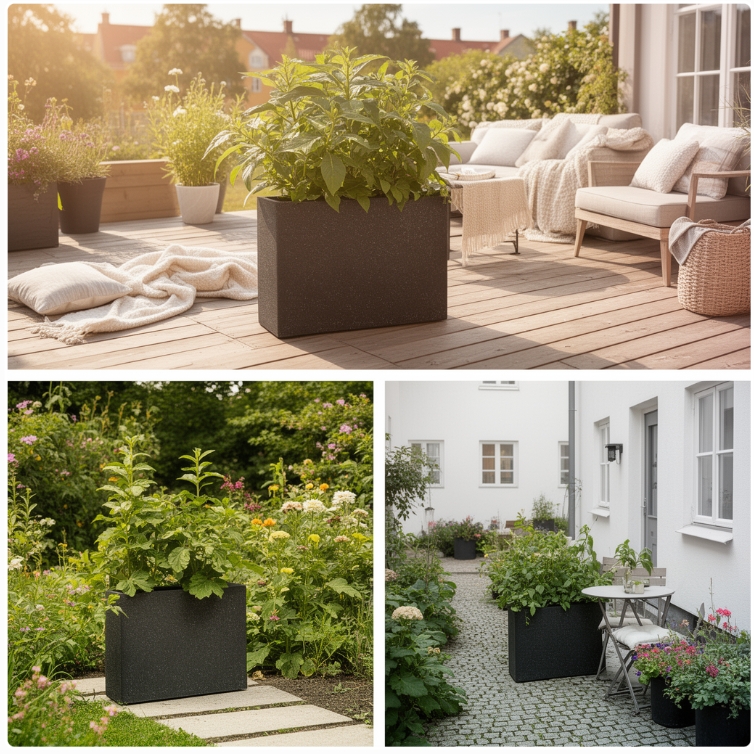 Esteras krukker er fremstillet i et glasfiber- og mineralkomposit materiale, som kombinerer styrke og letvægt på en unik måde. Disse krukker er ekstremt holdbare, modstandsdygtige over for både vejr og frost, og kræver minimal vedligeholdelse.
